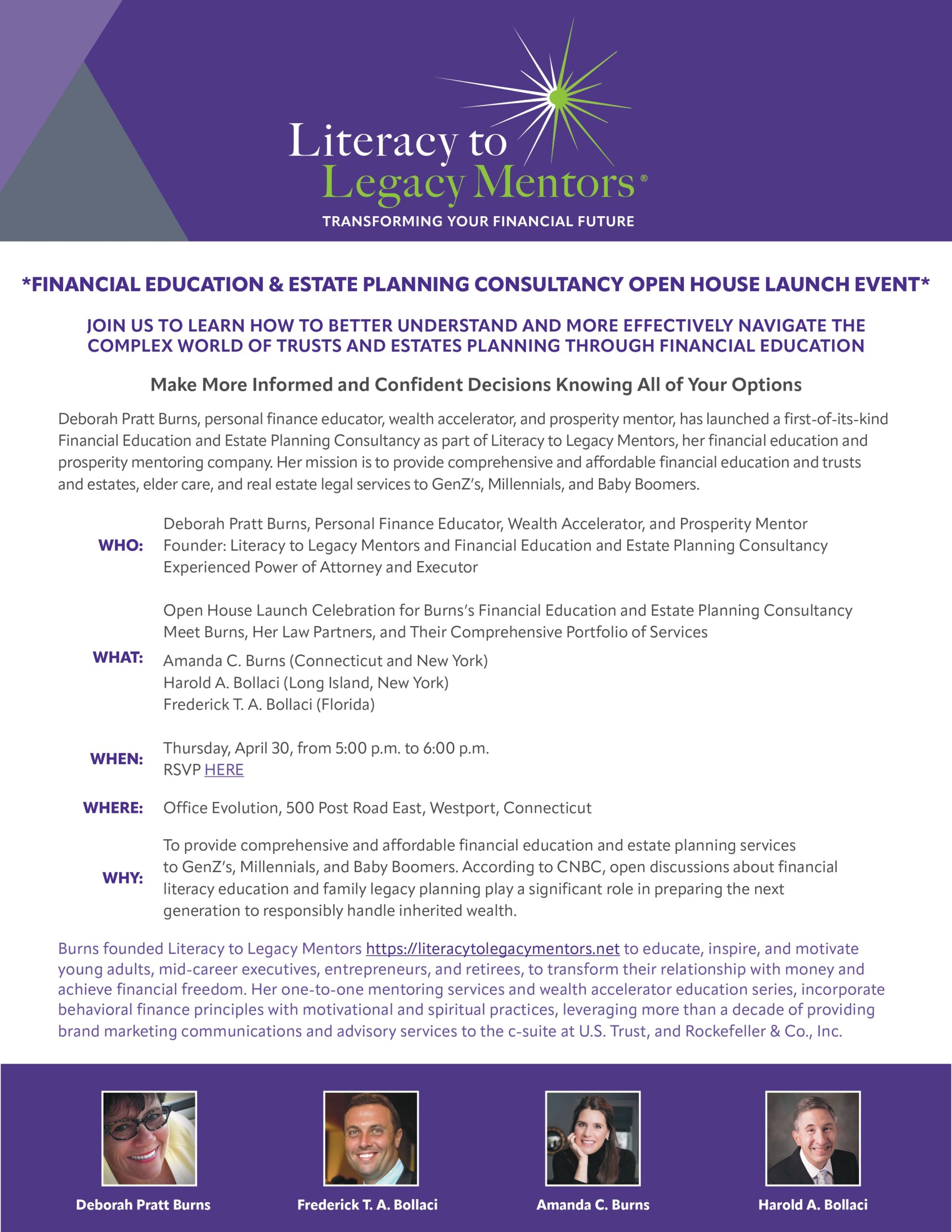 Deborah, an internationally award-winning brand marketing executive, is the founder, chief prosperity officer and mentor of Literacy to Legacy Mentors® LLC, Transforming Your Financial Future, a Pratt Prosperity company. For three decades, she has built a proven track record of effectively educating and mentoring young adults, entrepreneurs, businesspeople, affluent individuals and families, and retirees to become more financially savvy and successful.